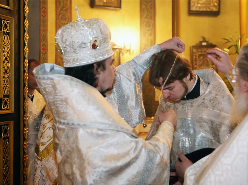 Вот, наконец, последняя деталь: владыка надевает на шею ставленнику священнический крест. На лицевой стороне этого креста изображено Распятие. На оборотной стороне – надпись, которую каждый священник знает наизусть. Это слова Апостола Павла о том, каким должен быть пастырь: «Образ буди верным словом, житием, любовию, духом, верою, чистотою (1 Тим. 4, 12)». В переводе на русский язык эти слова звучат так: «Будь образцом для верных [то есть для всех христиан] в слове, в житии, в любви, в духе, в вере, в чистоте».
