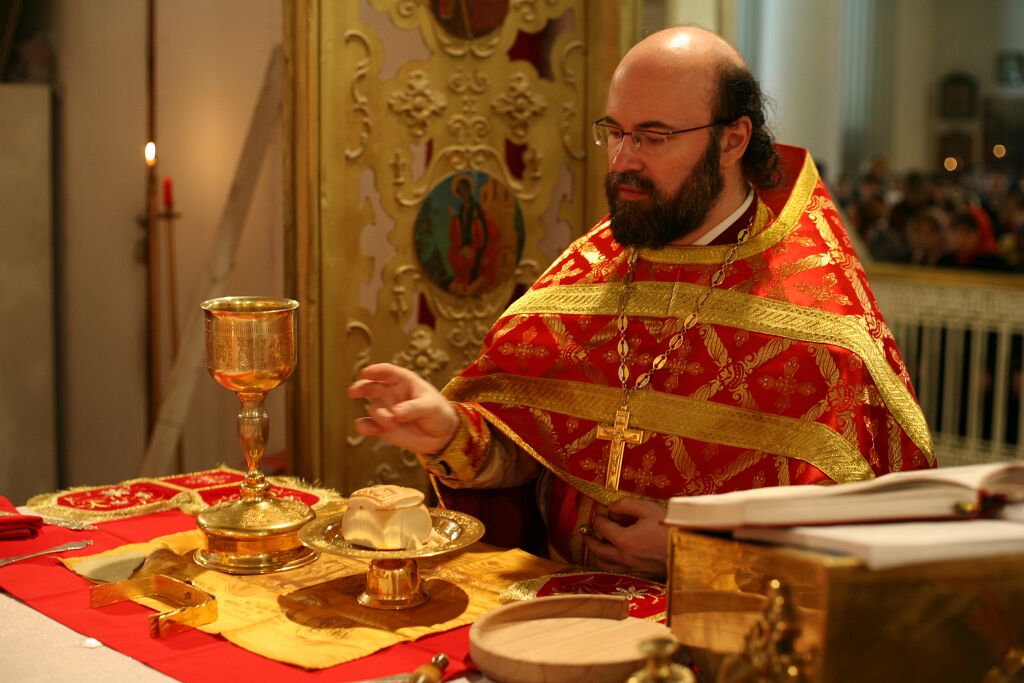 Протоиерей Георгий Антонов совершает Литургию. На антиминсе стоят священные сосуды. На фотографии изображен момент Литургии, когда мы просим Бога силою Духа Святого преложить хлеб и вино в Тело и Кровь Христовы.