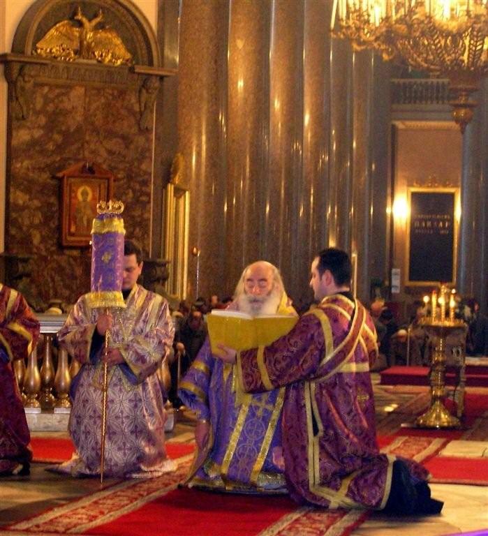 Затем все присутствующие в храме и владыка молятся о ниспослании Духа Святого на антиминсы, преклонив колена.