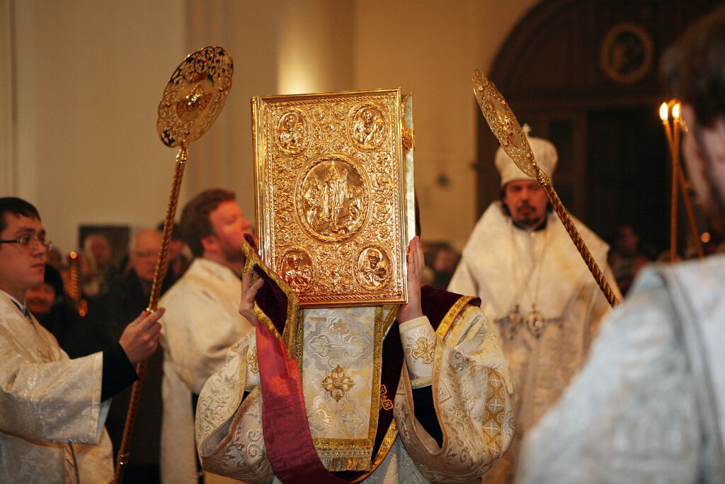 На этой фотографии – протодиакон (старший диакон) возглашает: «Премудрость, прости» и крестообразно осеняет пространство перед собой. Иподиаконы (помощники диакона, принимающие участие в архиерейском богослужении) держат рипиды – особые жезлы с пластинами, на которых изображены Ангелы. В древности подобные рипиды, или опахала, использовались в практических целях – ими веяли над святыней, чтобы туда не сели летучие насекомые. Сегодня рипиды несут символический смысл. Ими веют над святыней, показывая легкокрылое и неуловимое присутствие рядом с нами Ангелов.