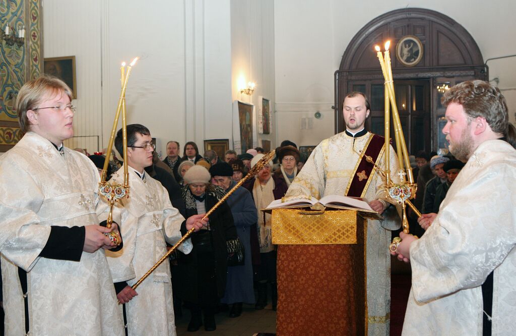 Если во время обычной Литургии Евангелие читается на амвоне (площадке перед алтарем), то во время архиерейского богослужения Евангелие читается на середине храма, на «архиерейском» амвоне. В знак того, что благословение на чтение дано епископом (архиепископом, митрополитом, Патриархом), возле аналоя стоят иподиаконы с рипидами, а также иподиаконы с дикирием и трикирием.