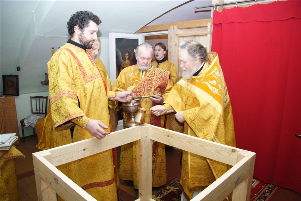 Вообще освящение престола совершает архиерей, но в маленьких храмах (как, например, вот этот пещерный маленький храм, устроенный в подвале Казанского кафедрального собора), крестильных и иных по благословению владыки престол освящает настоятель. Так было и в этом случае.
