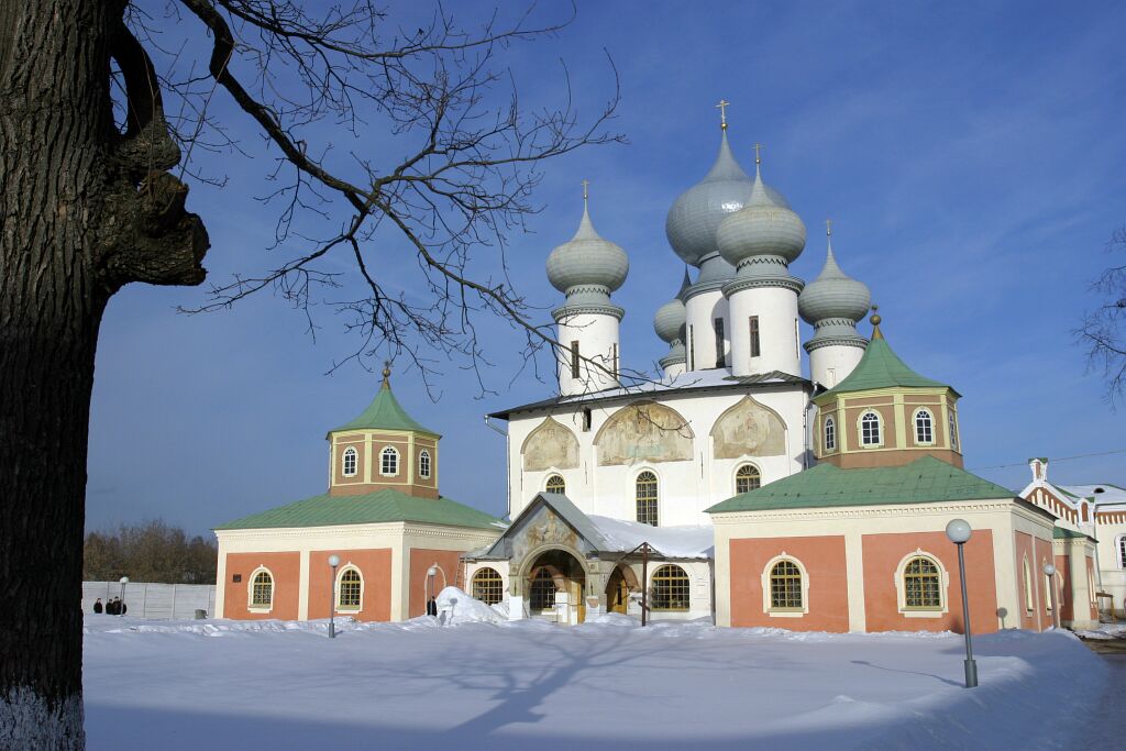 Храм 16-го века (Успенский собор) Тихвинского Успенского монастыря (Санкт-Петербургская епархия). К храму пристроены в 19-м веке домики, в которых располагаются церковные магазины.