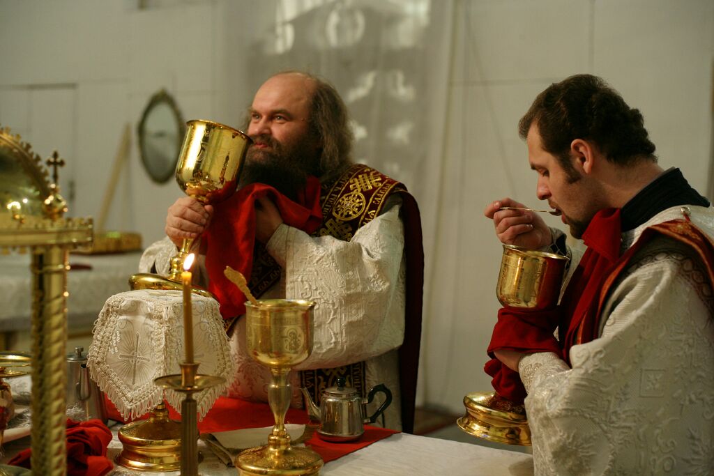Жертвенник ◄ Назад Вперёд ► Потребление Даров После причащения верующих Дары (оставшиеся Тело и Кровь Христовы) благоговейно доедают диаконы. Это называется потреблением Даров. 1 2 3 4 5 6 7 8 9 10 11 12 Все фотографии галереи