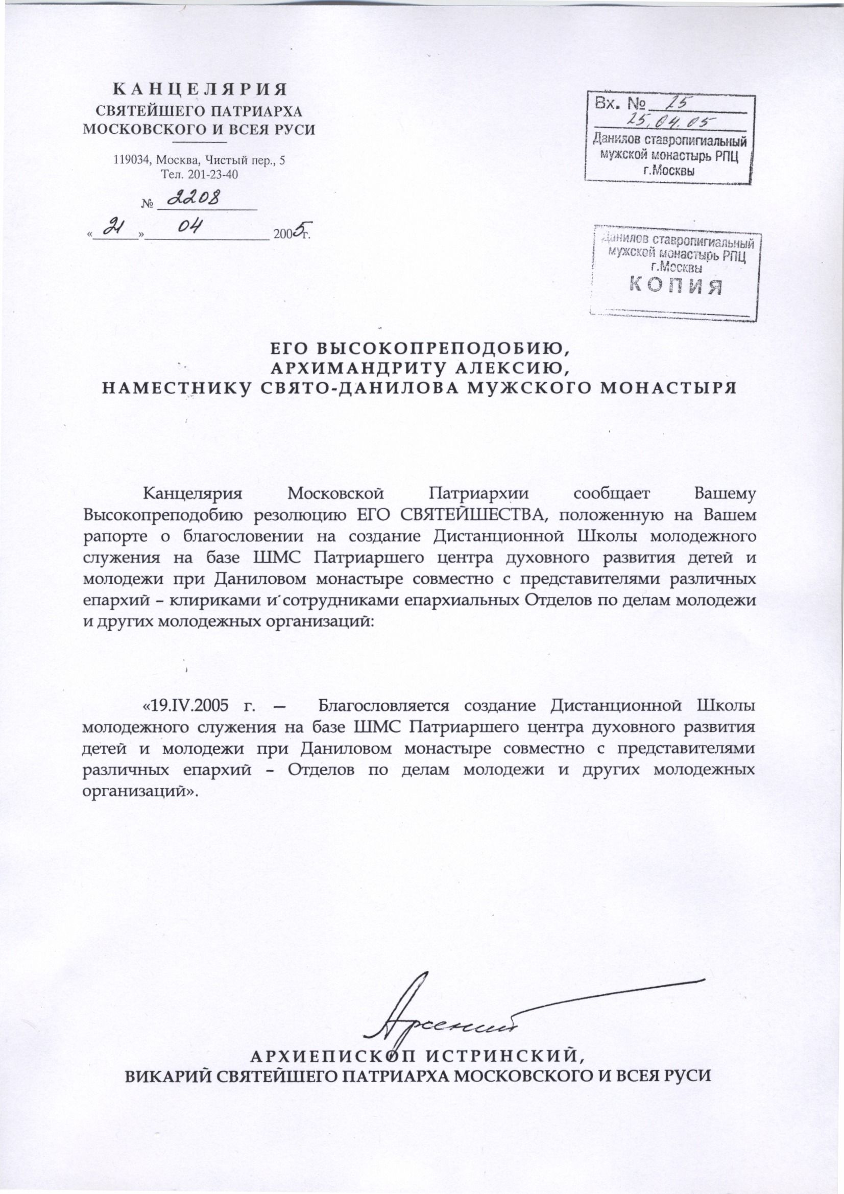 называемый «Школа молодежного служения». В условиях общей популярности дистанционного образования и интенсивного развития православного сегмента Интернета, руководством ПЦДРДМ было принято решение разработать дистанционный интернет-курс по образцу «Школы Молодежного Служения». На это было получено благословение Наместника Данилова монастыря архим.Алексия (Поликарпова) и затем Святейшего Патриарха Московского и всея руси Алексия II (№2208 от 21.04.2005). Практическая реализация проекта стала возможной лишь в 2007 году. Тогда же решили принимать на курс не только молодежь, но и всех желающих, и не только для обучения служению, но и просто для повышения «церковной грамотности».
