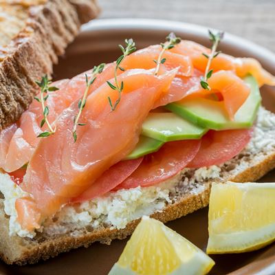 - Бутерброд с помидором, рыбой и авокадо