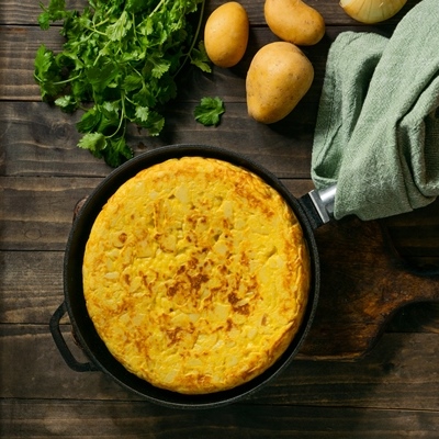 - К пюре прибавляют сметану, яйца, растопленного масла, разравнивают на сковороде, посыпают сухарями и запекают.