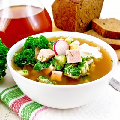 - Перемешать, разложить по порционным тарелкам и залить квасом.