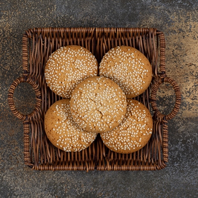 - Мокрыми руками выложите кусочки теста на противень, смазанный маслом или проложенный пекарской бумагой и посыпьте семенами кунжута. Запекайте печенье в разогретой духовке при 180-200 градусах около 20 минут.