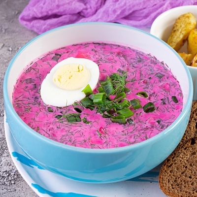 - Заправить свекольник сметаной, перемешать, разлить по порционным тарелкам и дополнить каждую порцию отварным яйцом и мелко нарубленной зеленью.