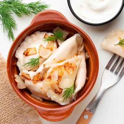 - Подавать вареники с маслом, обжаренным луком и со сметаной.
