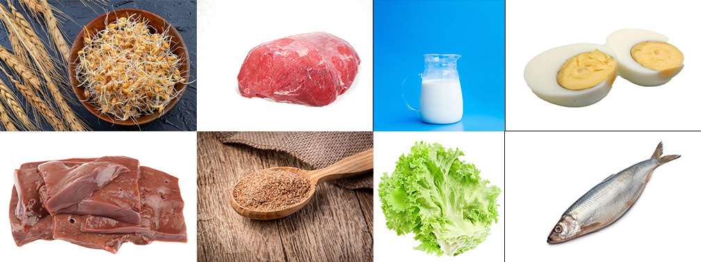 Продукты содержащие этот витамин: проростки и отруби пшеницы, зеленые лиственные овощи, мясо, печень, рыба, молоко, яйца.