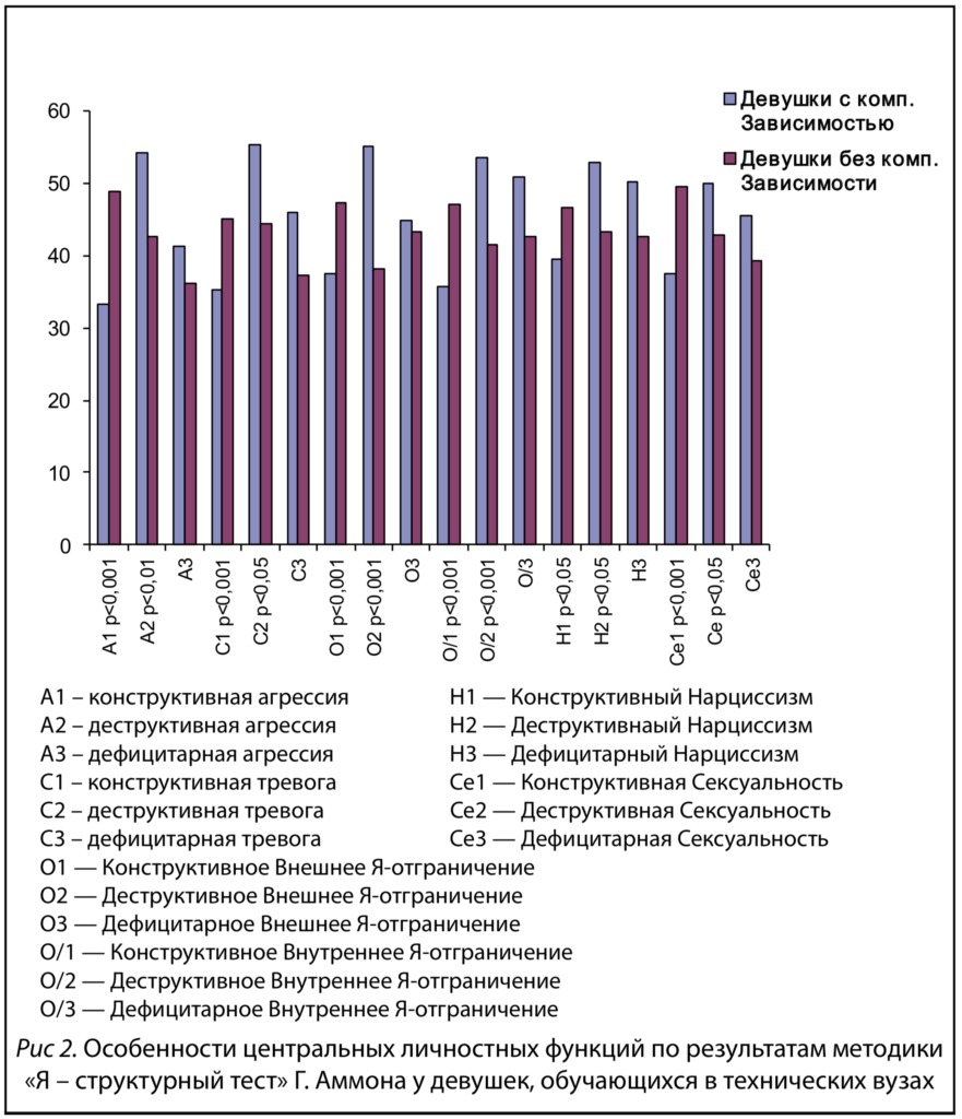 Как видно из рисунке 2, наблюдаются достоверные отличия (p<0,05, p<0,001) в подгруппах девушек – студенток технических вузов (имеющих и не имеющих зависимости от компьютера и Интернета).