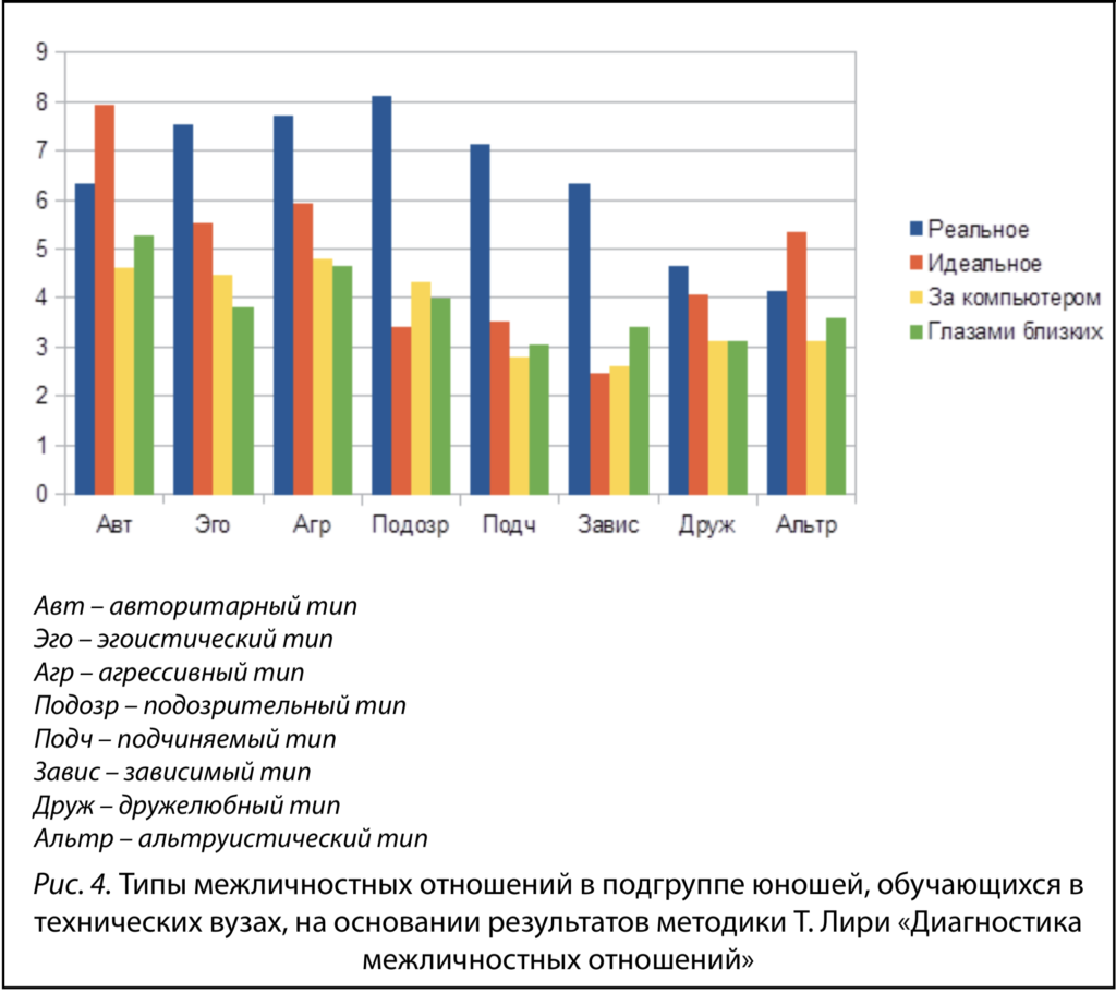 На Рис. 4 представлены результаты анализа типов межличностных отношений при оценке своего «Реального Я», «Идеального Я», «Я за компьютером» и «Я глазами близких» в подгруппе юношей, обучающихся техническим специальностям, с признаками зависимости от Интернета.