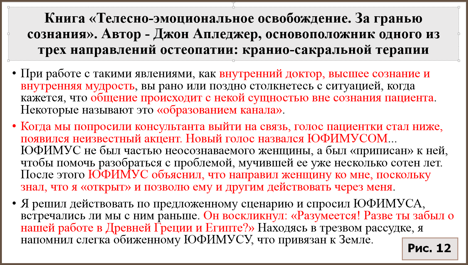 Апледжер придумал концепцию «энергетической кисты» как некоего сгустка не известной науке энергии в теле, который якобы образуется у человека в результате физической или психологической травмы и в отдаленном периоде вызывает у него болезни и создает разные проблемы в жизни. Для избавления от «энергетической кисты» Апледжер изобрел метод «телесно-эмоционального освобождения» (другие названия: сомато-эмоциональное освобождение, сомато-эмоциональный релиз), и изложил описание всех этих своих оккультных техник в книге «Телесно-эмоциональное освобождение. За гранью сознания», цитаты из которой мы и привели выше (рис. 12-14). Профессор Джин Мерсер в своей книге показывает неправдоподобие, отсутствие логики и доказательной базы у данных концепций [23, глава 5 «Телесно-ориентированная терапия, пассивная и активная»]. Попутно заметим, что у истоков концепции об эмоционально-мышечных энергетических блоках в теле человека стоял австрийский психолог, неофрейдист, пропагандист теории свободной сексуальной жизни, Вильгельм Райх. Он известен как создатель телесно-ориентированной терапии и в не меньшей степени – как «зачинщик» мировой сексуальной революции [38].